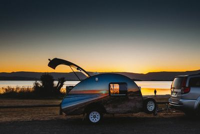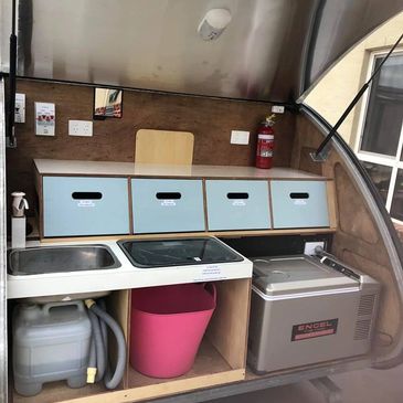 The kitchen has a 32 liter Engel fridge. You can fit a very good amount of food in this fridge. It has 2 gas burners and comes with a fully equipped kitchen. We include the pots and pans, cutlery, cups and bowls and a kitchen sink.